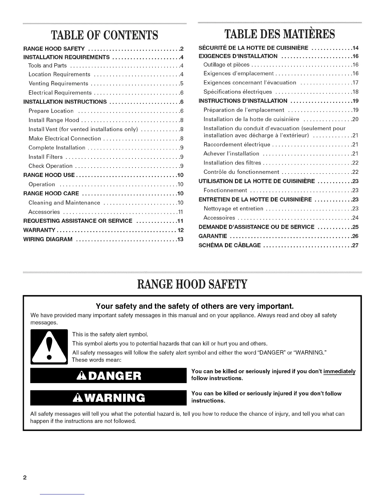 RANGE HOOD SAFETY ............................... 2
