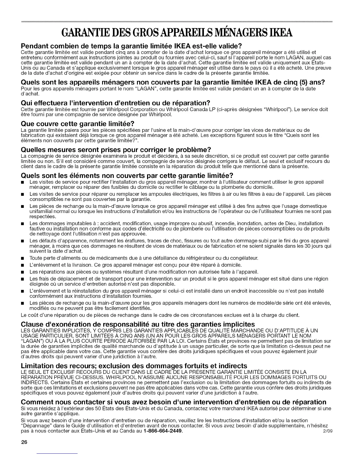 entretenu conformement aux instructions jointes au produit ou fournies avec celui-ci, sauf si I'appareil porte le nom LAGAN, auquel cas