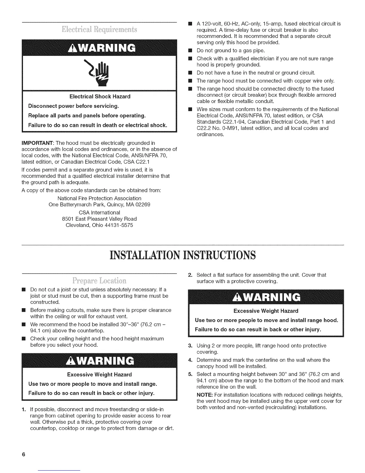Use two or more people to move and install range hood.