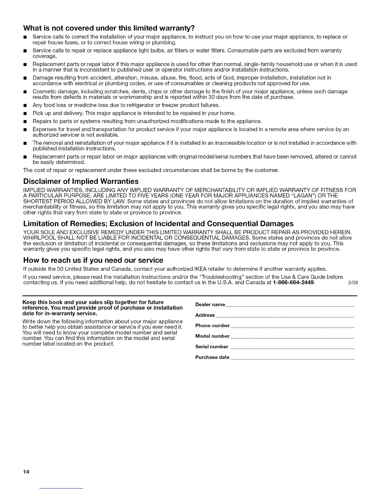 contacting us. If you need additional help, do not hesitate to contact us in the U.S.A. and Canada at 1-866-664-2449. 2/09