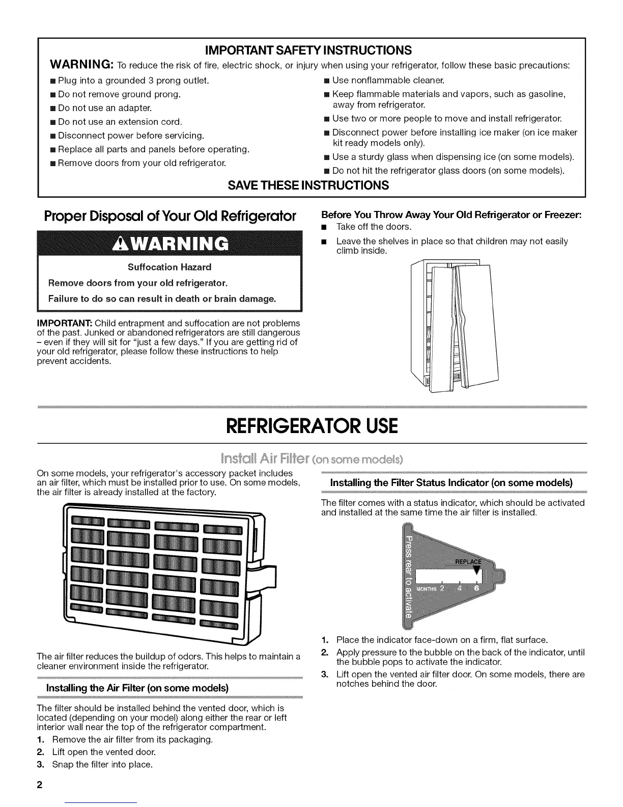 an air filter, which must be installed prior to use. On some models, Installing the Filter Status Indicator (on some models)