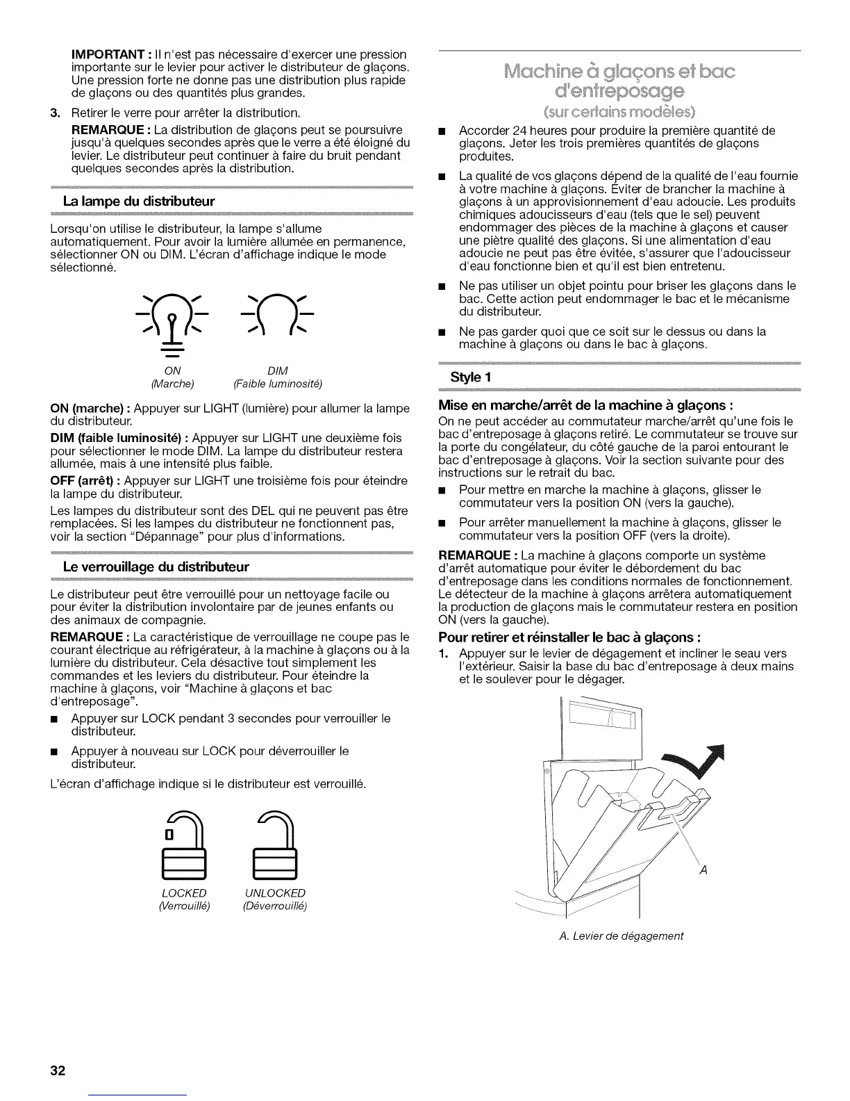 importante sur le levier pour activer le distributeur de gla(;ons.