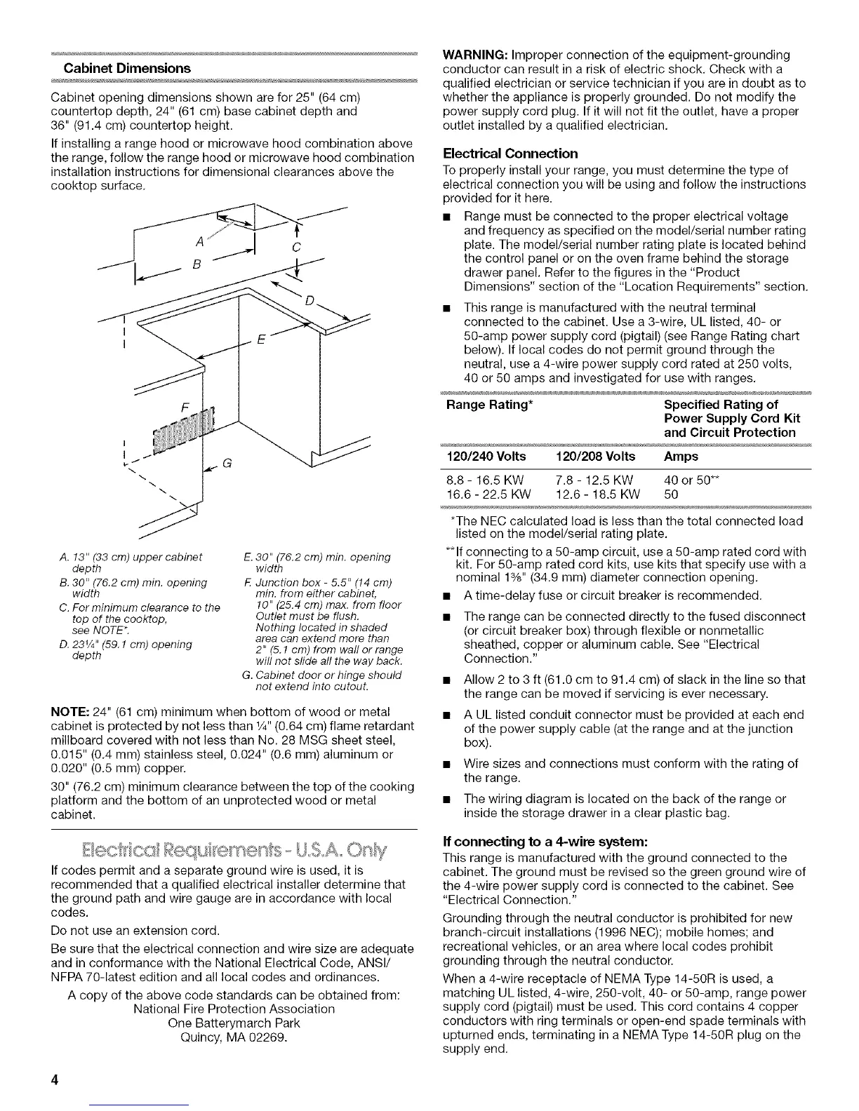 50-amp power supply cord (pigtail) (see Range Rating chart