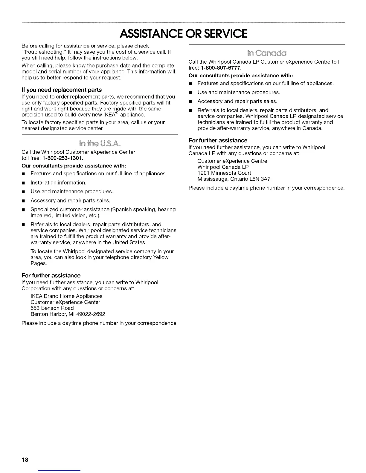 Call the Whirlpool Canada LP Customer eXperience Centre toll