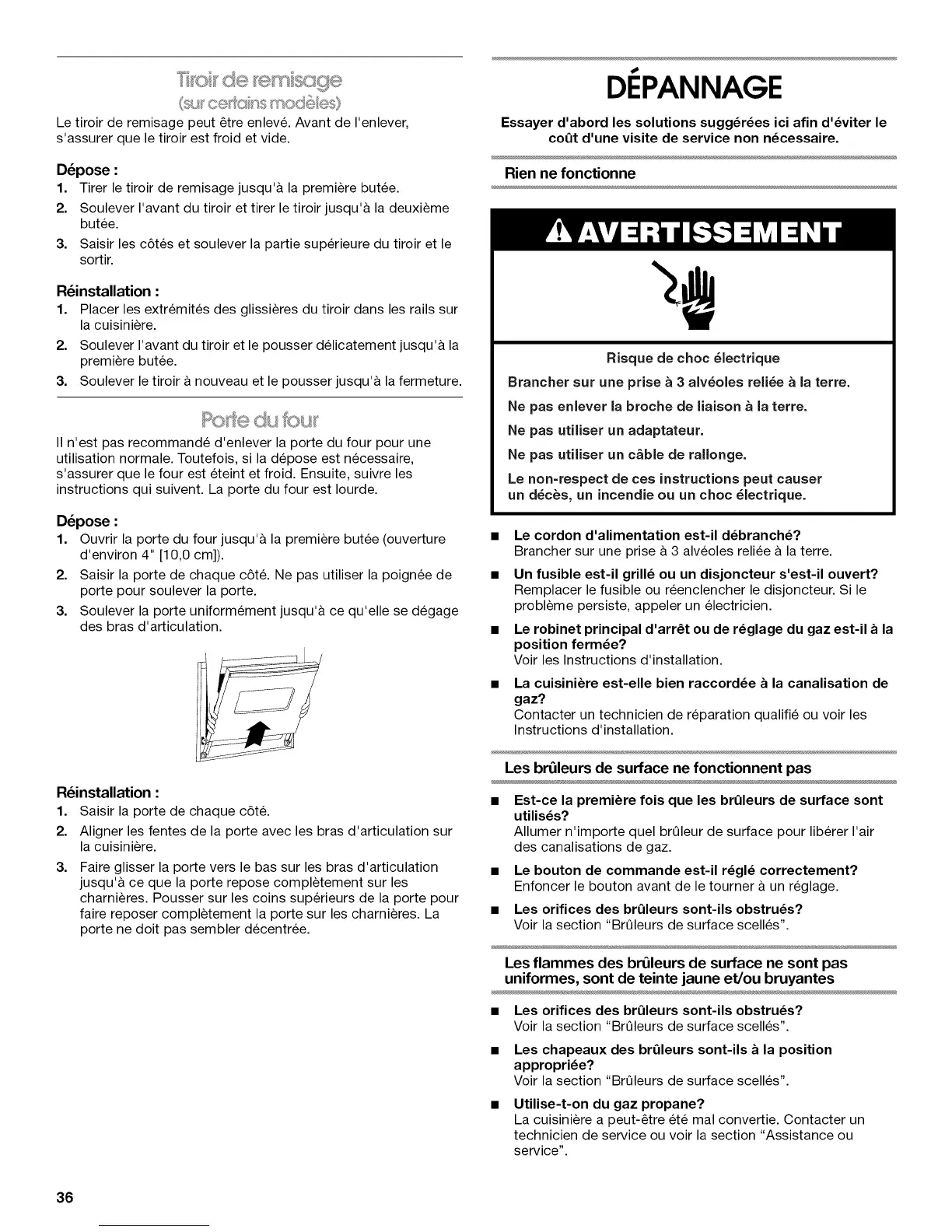 Le tiroir de remisage peut 8tre enlev& Avant de I'enlever,