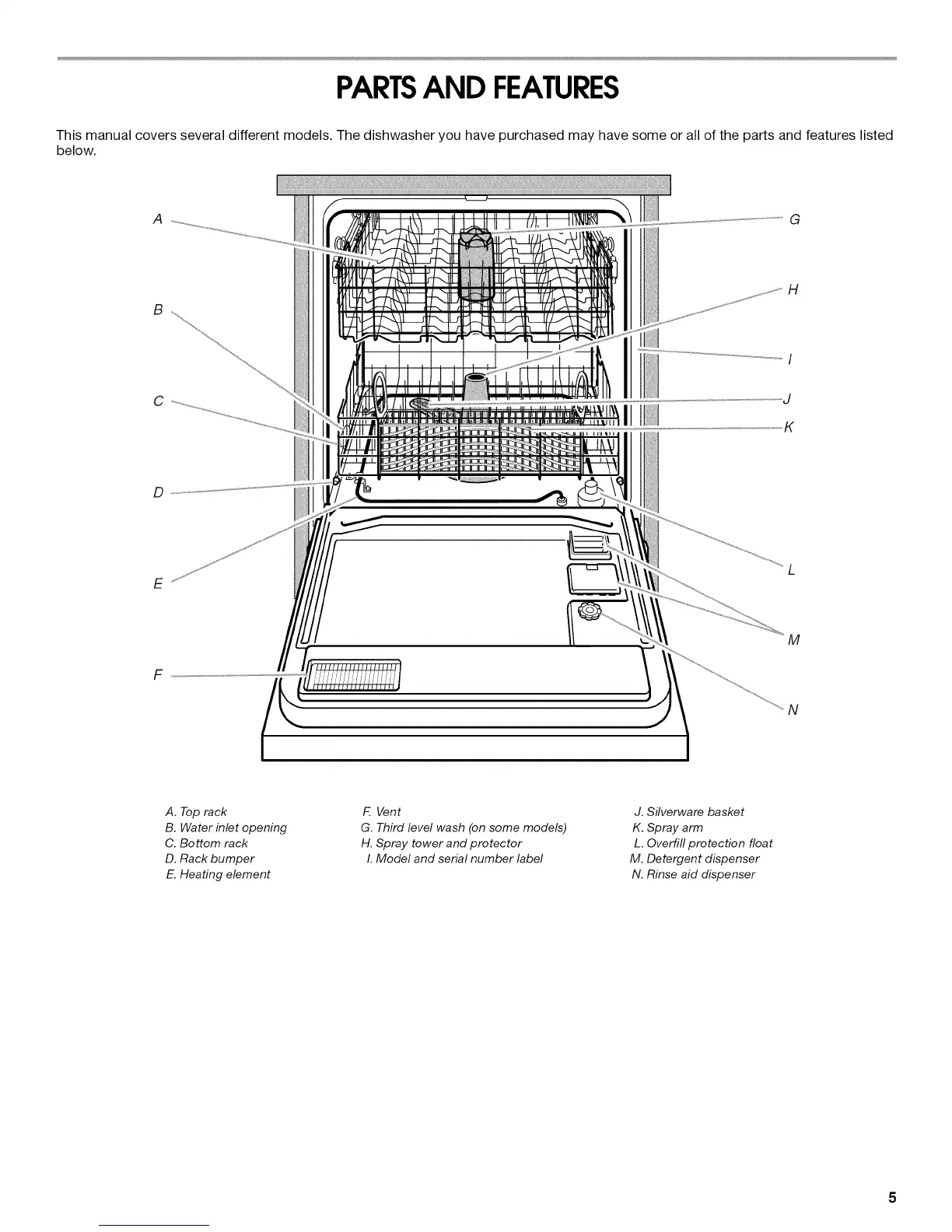 This manual covers several different models. The dishwasher you have purchased may have some or all of the parts and features listed