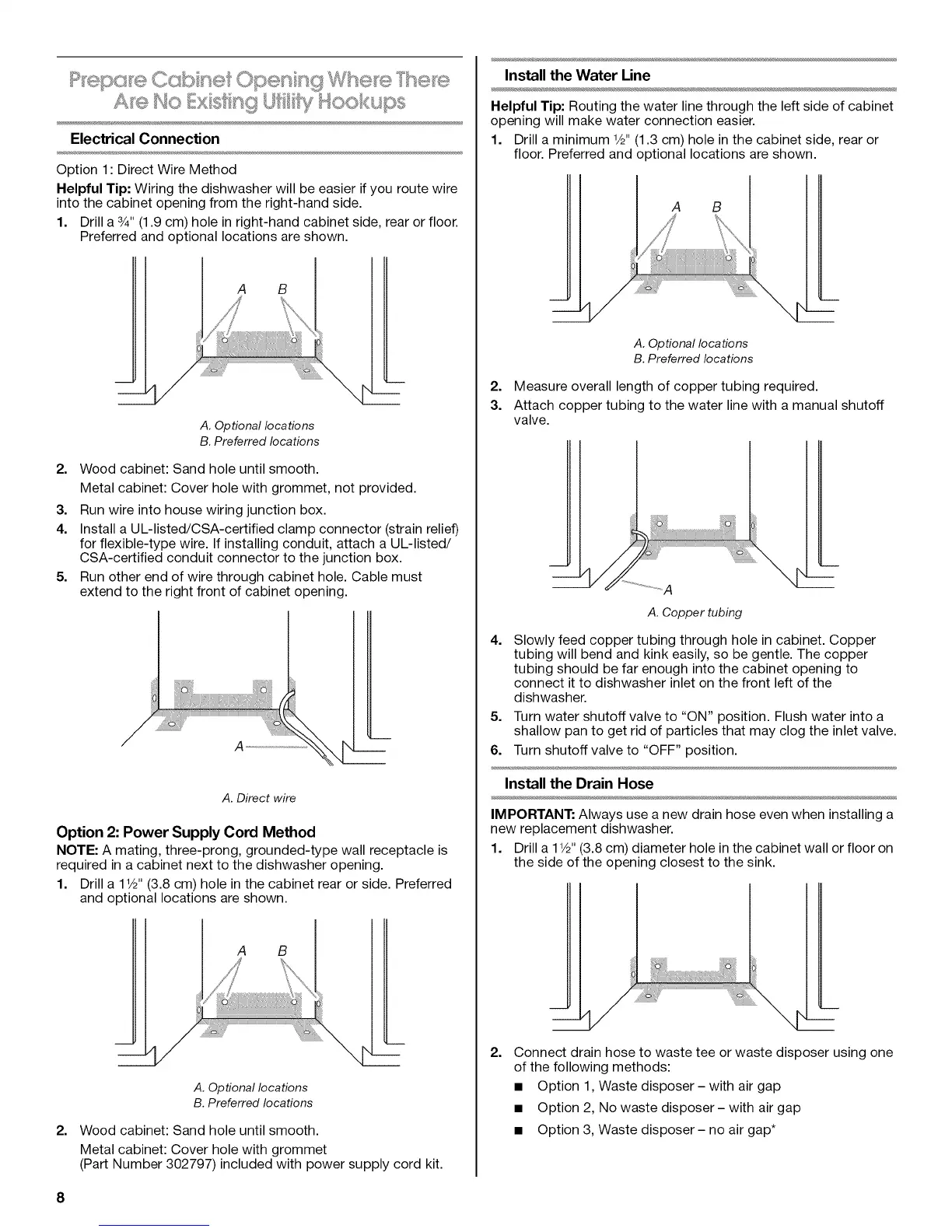 1. Drill a 1V2"(3.8 cm) hole in the cabinet rear or side. Preferred