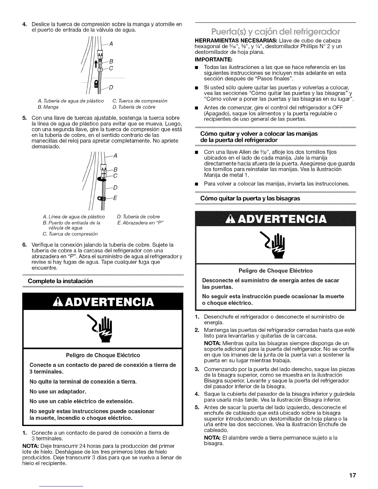 Verifique la conexi6n jalando la tuberia de cobre. Sujete la