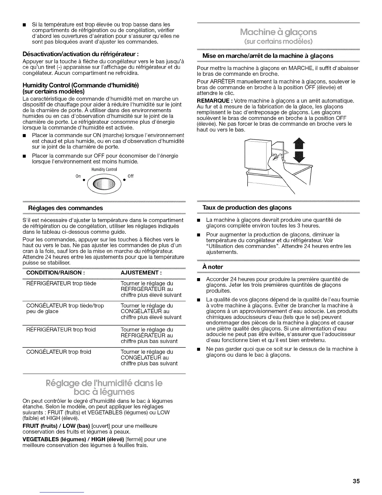 de refrigeration ou de congelation, utiliser les reglages indiques