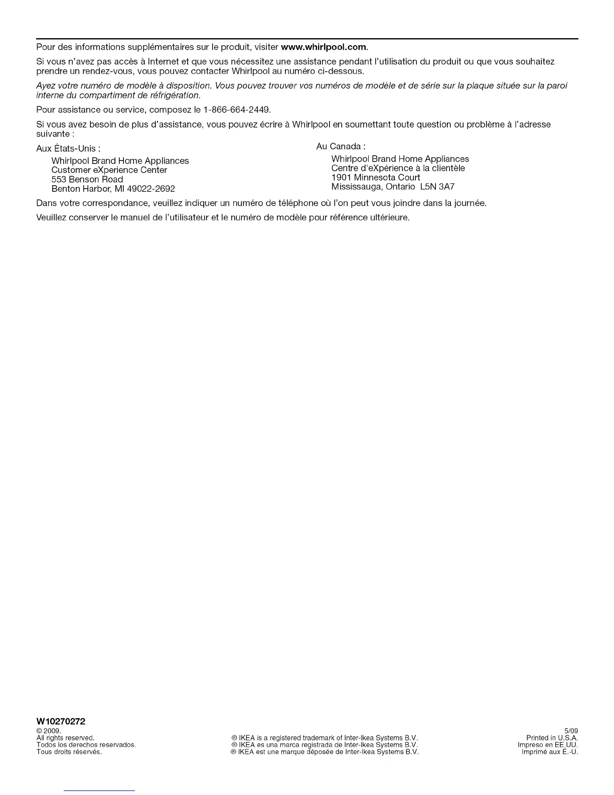 Pour des informations supplementaires sur le produit, visiter www.whirlpool.com.
