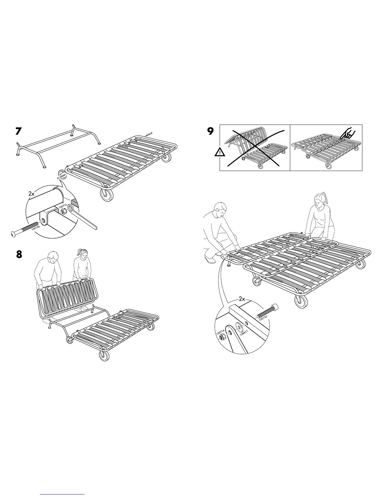 IKEA PS SOFA BED FRAME - Steps 7 & 8: Connecting Frame and Unfolding; Step 9: Usage and Safety Warnings