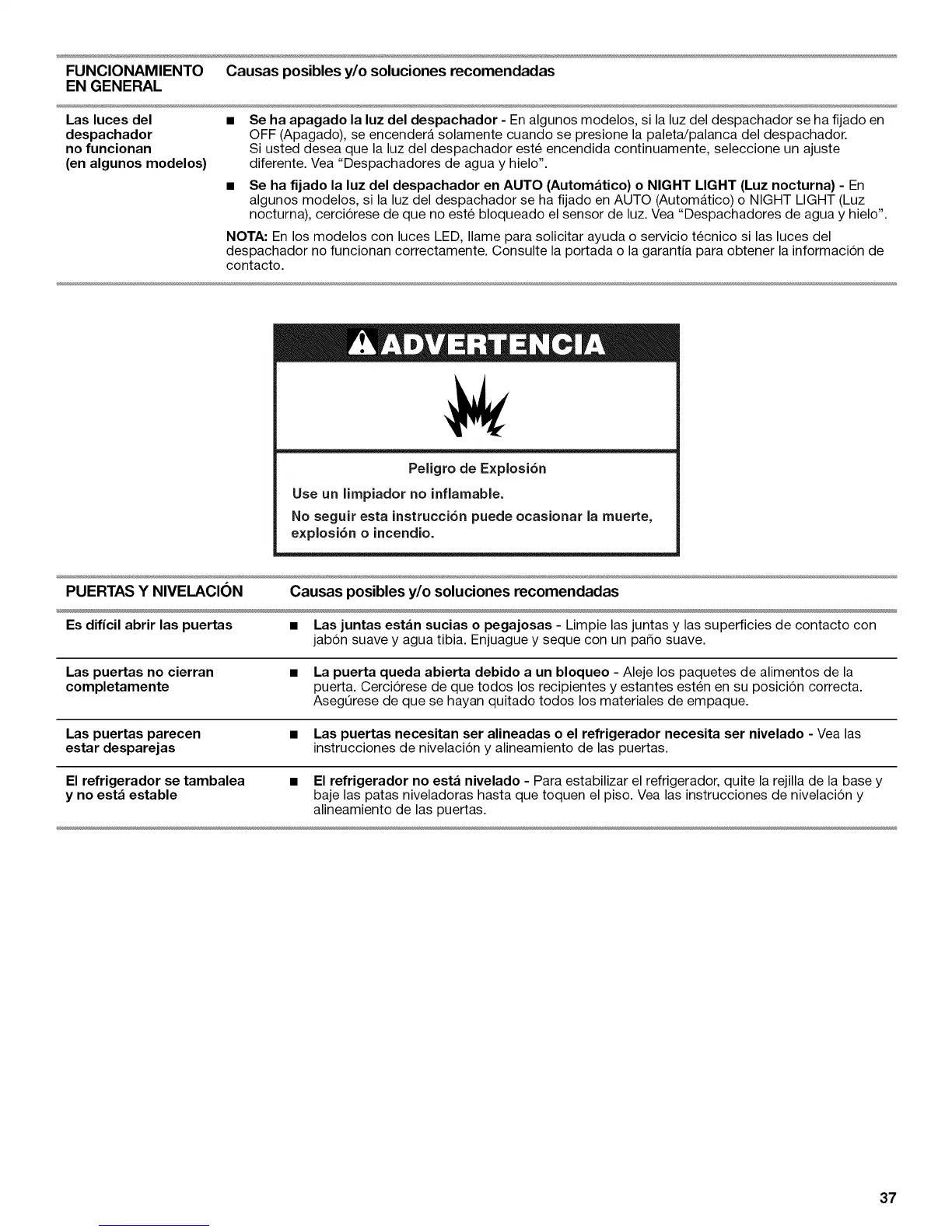 NOTA: En los modelos con luces LED, Ilame para solicitar ayuda o servicio tecnico si las luces del