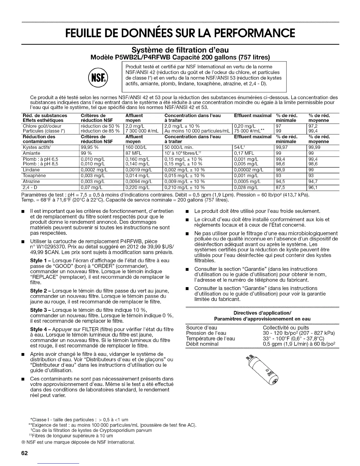 Parametres de test • pH = 7,5 _+0,5 & moins d'indications contraires. Debit = 0,5 gpm (1,9 Lpm). Pression = 60 Ib/po 2 (413,7 kPa).