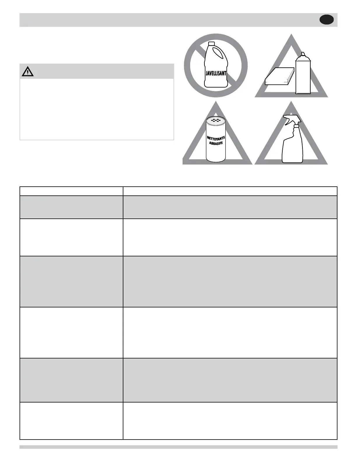 pas de nettoyants contenant des abrasifs, du chlorure, du chlore ou de