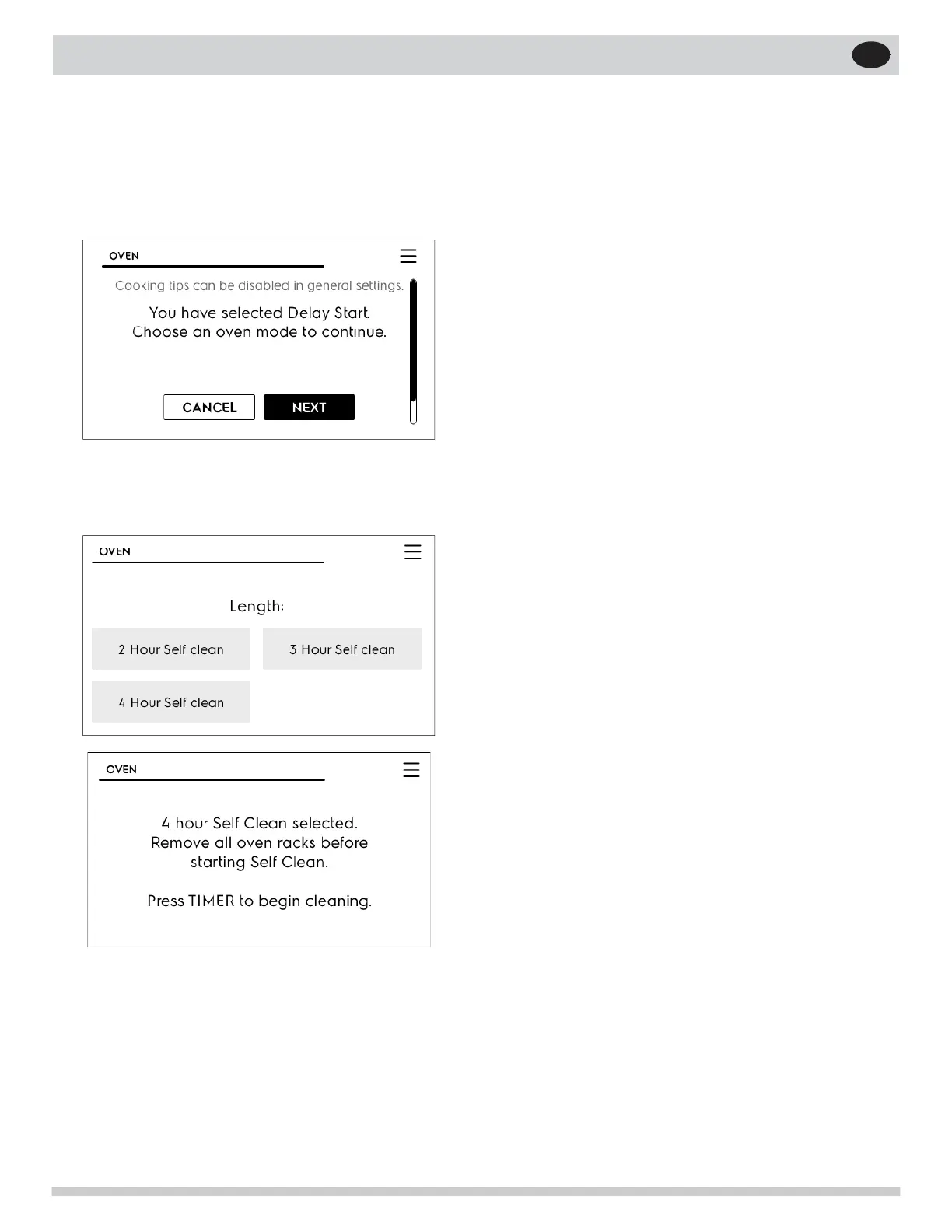 3. Touch NEXT and scroll Oven Modes to Self