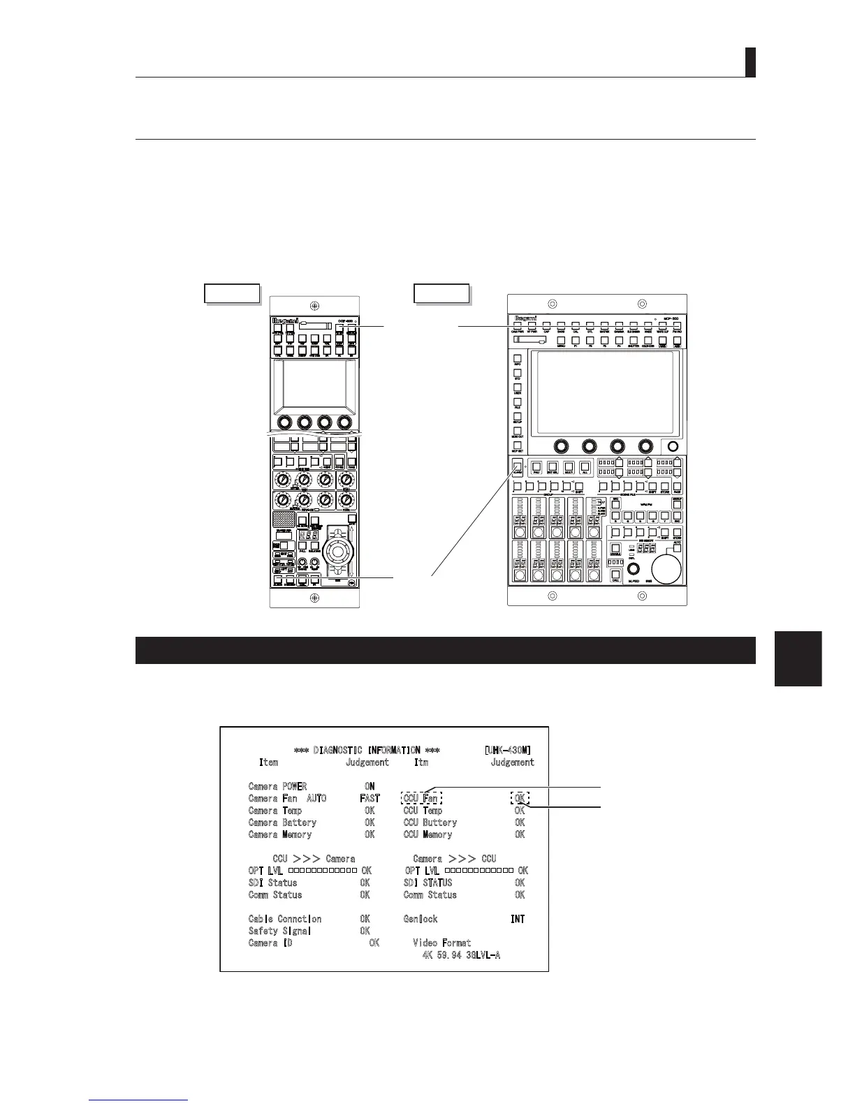 The CCU-480 is equipped with a self diagnostic function which monitors whether the CCU and camera are running normal. This