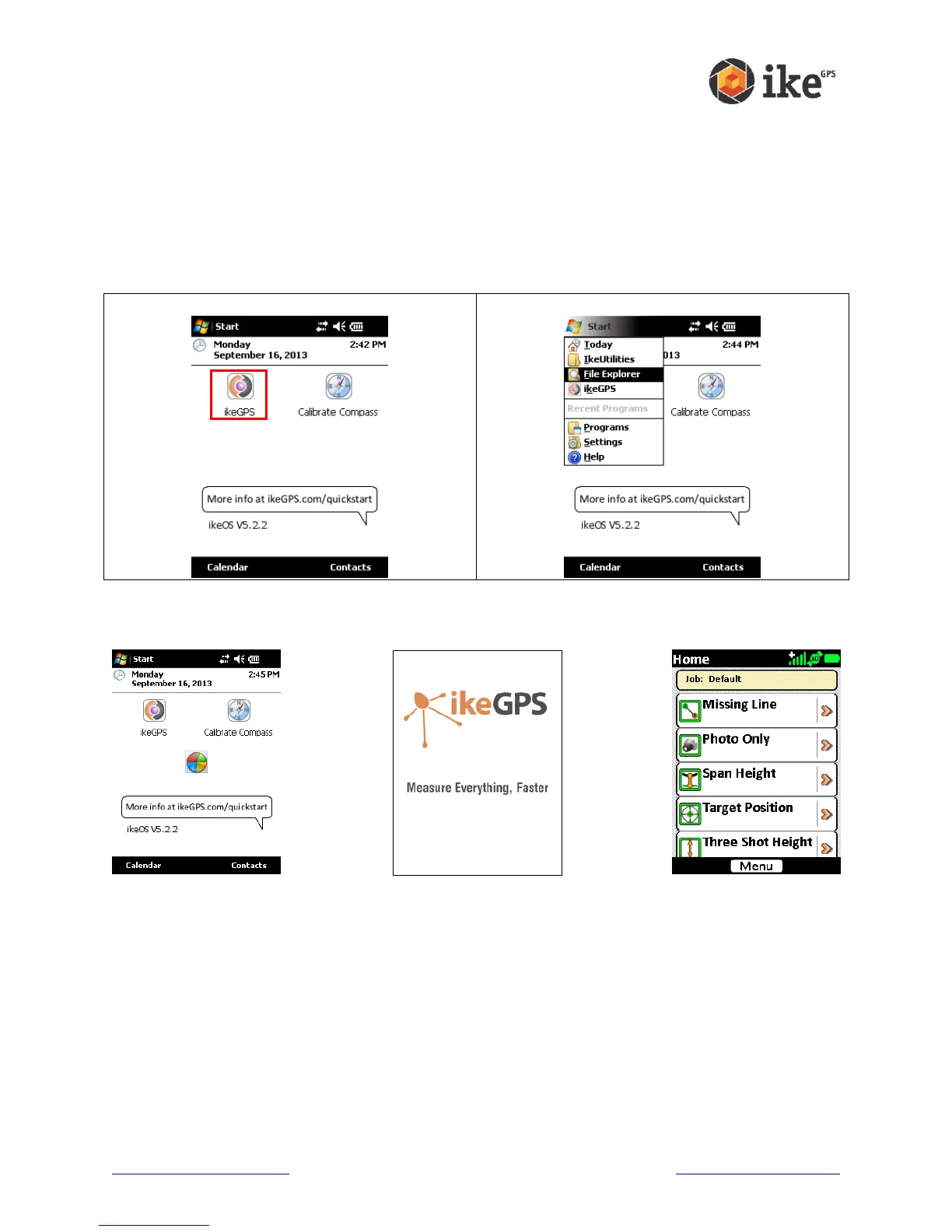 To start the ikeGPS application either tap the ikeGPS icon on the main Home screen, or from