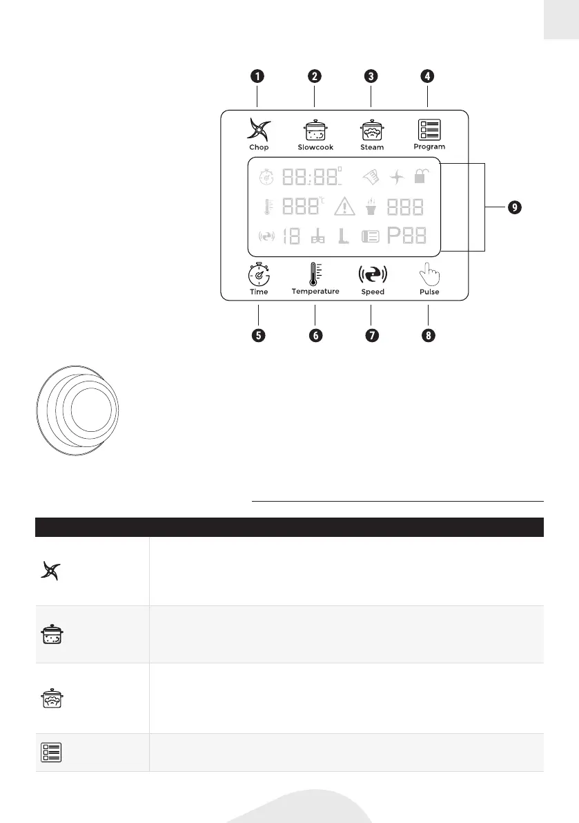 Programmaknop: druk hierop om vooraf ingestelde programma's te starten. Draai de knop om het