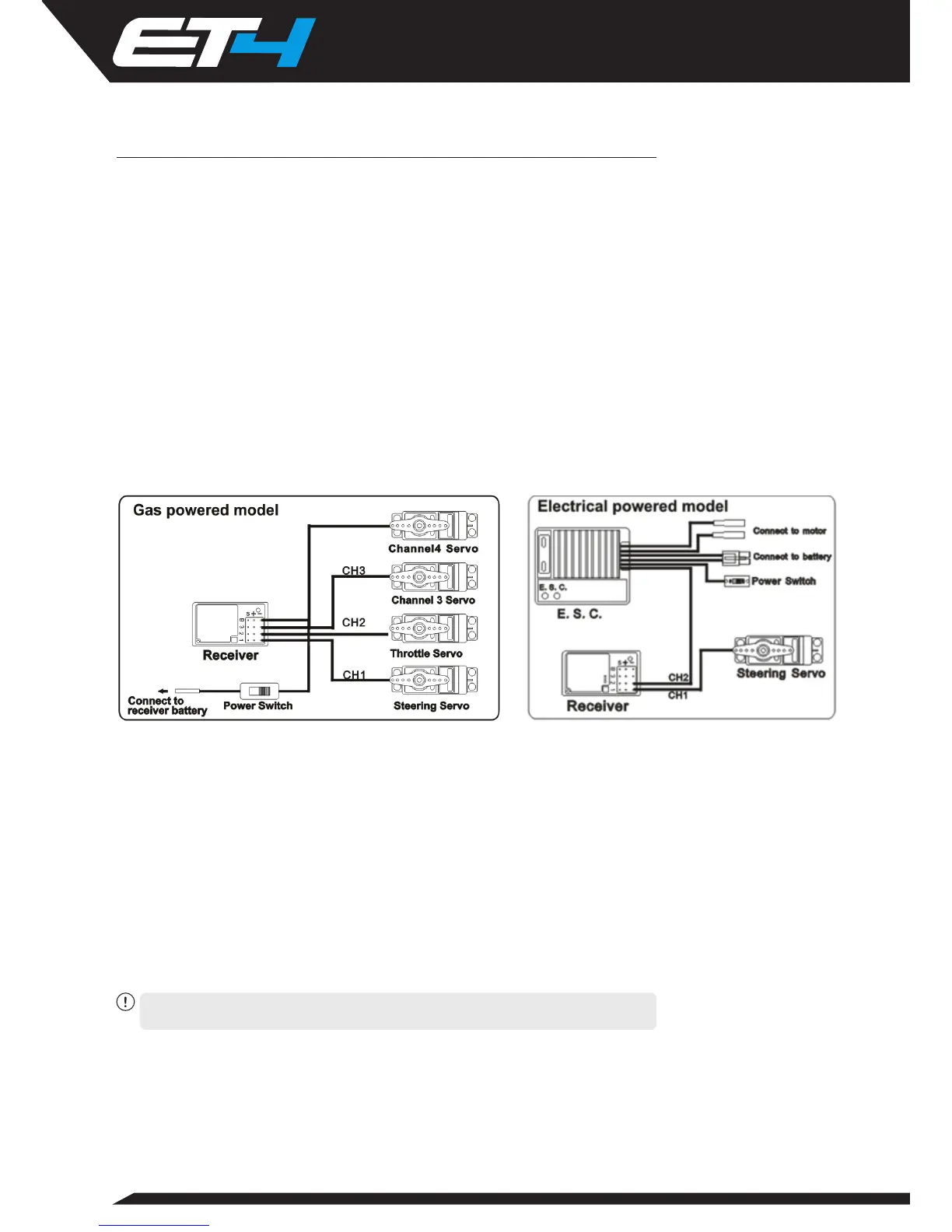 • Channel 2: Controlled by the trigger, connect to the ESC or a servo for
