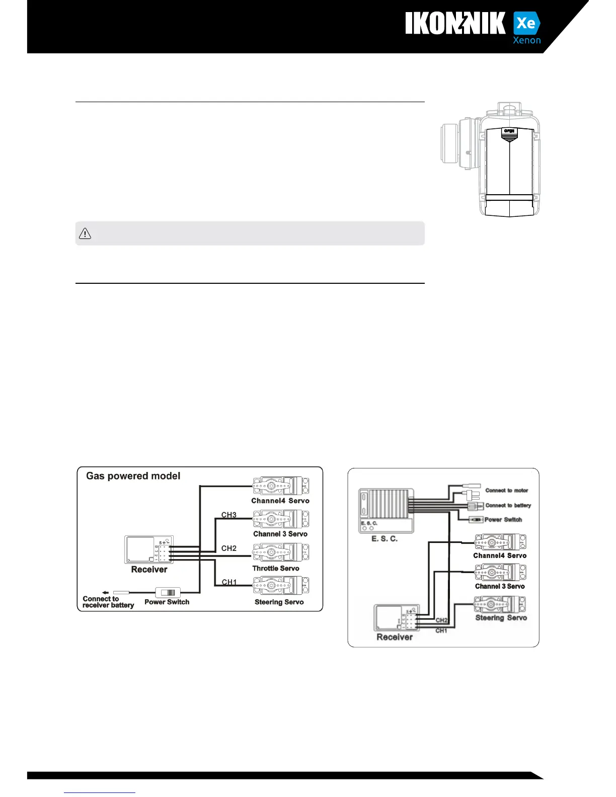 • Channel 2: Controlled by the trigger, connect to the ESC or a servo for