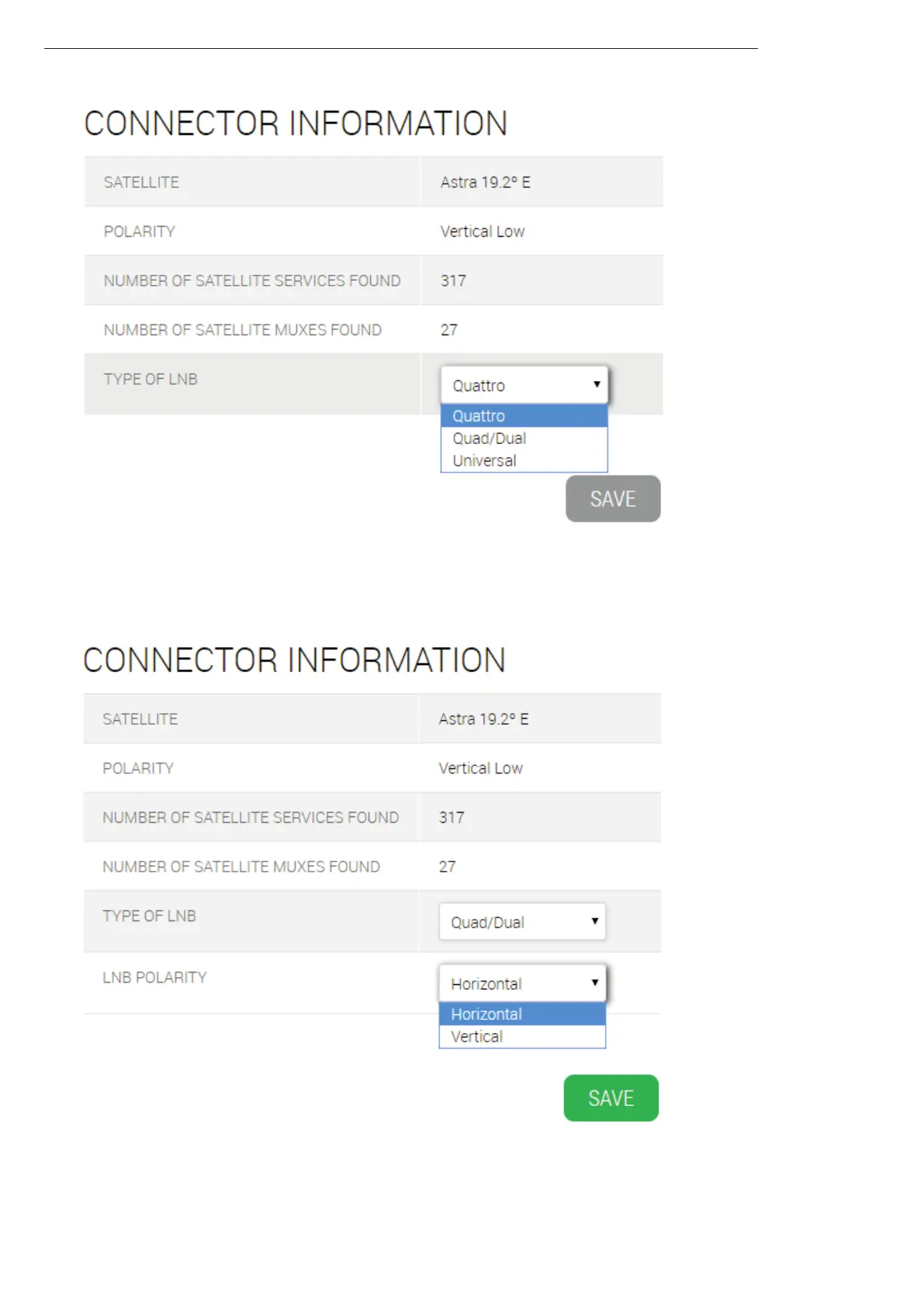 In the case you use a 13/18V without tones switching LNB (tipically used in Australia) select TYPE OF LNB: Quad/Dual.