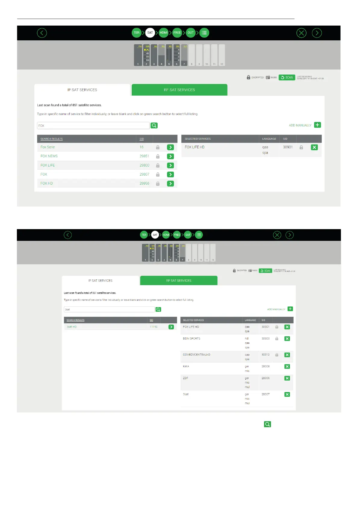 Repeat the process in the RF tap to configure the satellite services that must be conveyed in the RF network.