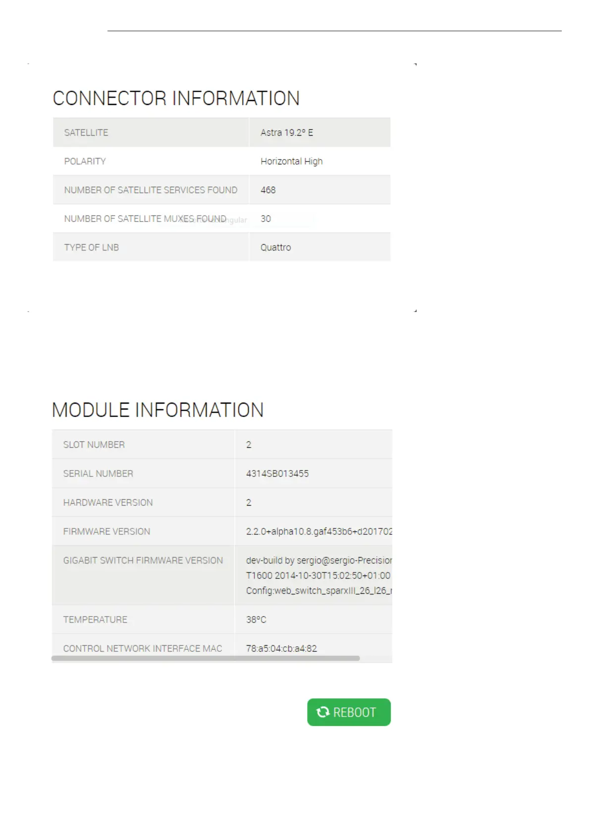 about the TV processing that it is performing. From this window, the module can be rebooted pushing “REBOOT” button.