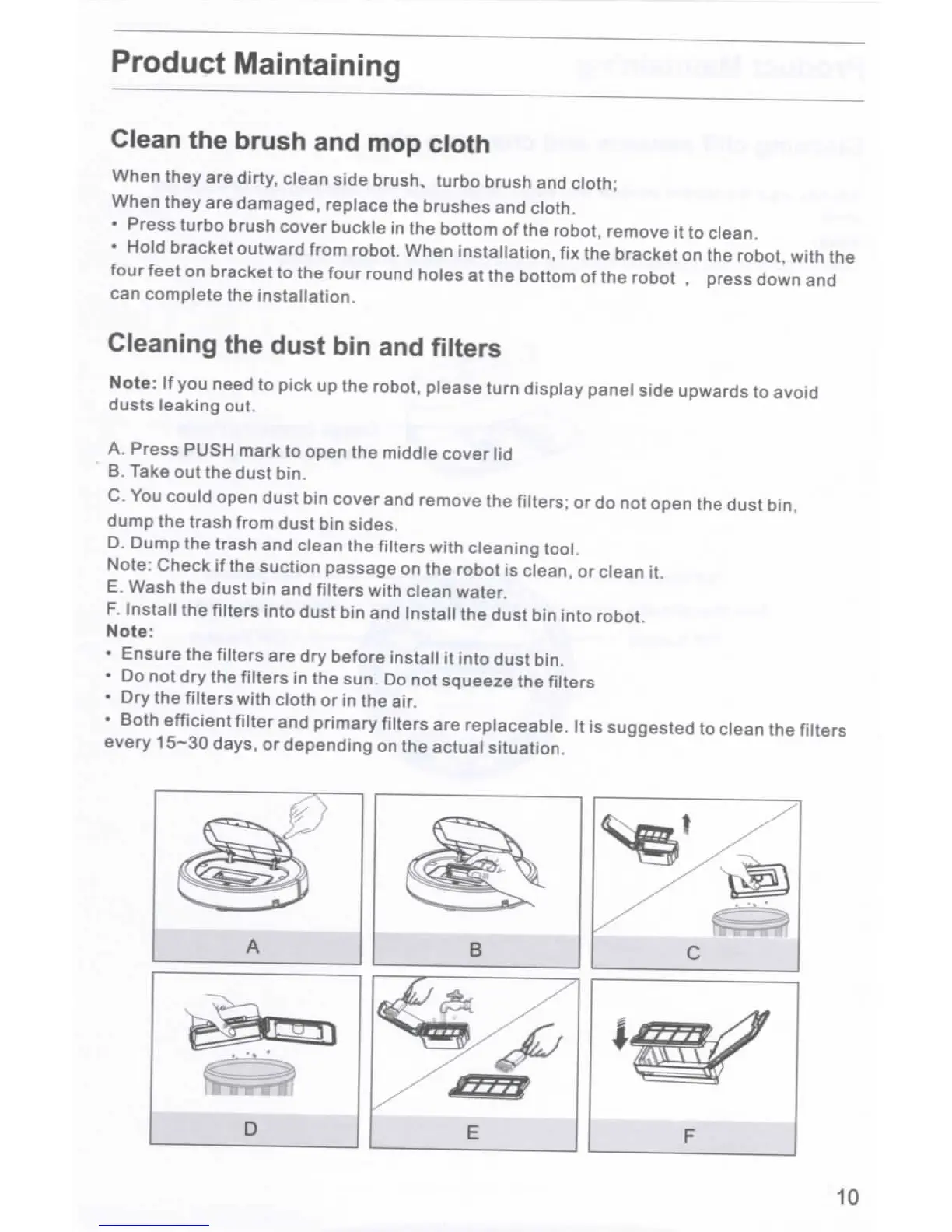 Ilife V7s - Product Maintaining; Clean the brush and mop cloth; Cleaning the dust bin and filters