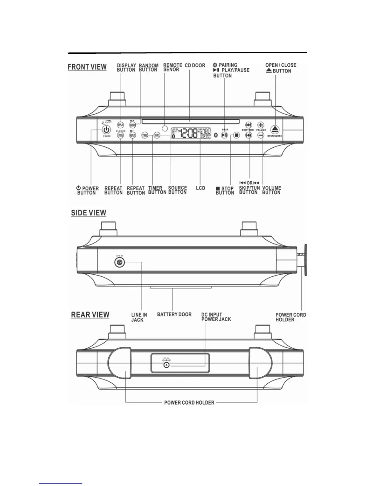 iLive IKBC384S - Main Unit Control Location; Front View Controls; Side View; Rear View Ports and Connectors