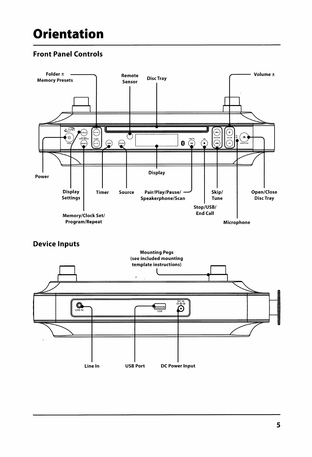 iLive IKBC384SMP3U - Device Orientation and Inputs; Front Panel Controls Overview; External Device Connections