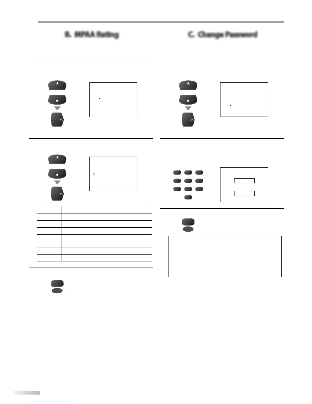 Use [CH K /L] to select “MPAA RATING”, then press