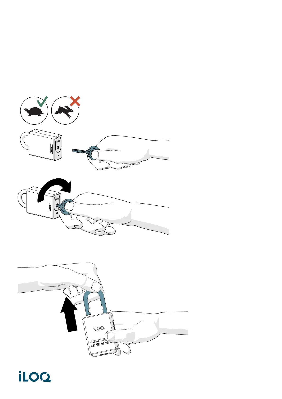 1. To open the H5S/H10S padlock, insert the iLOQ key slowly and turn clockwise.