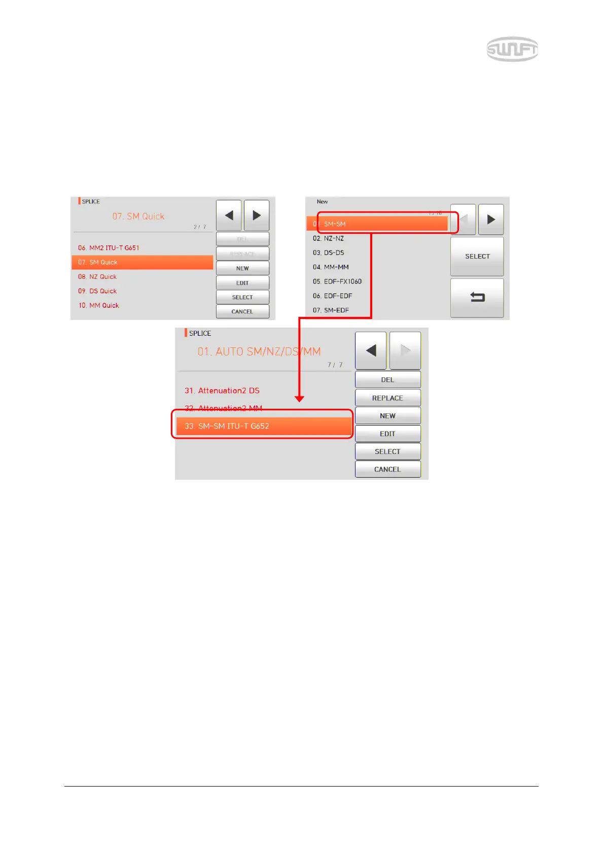 Touch NEW icon and splice modes saved on the database are displayed on the screen. Select a