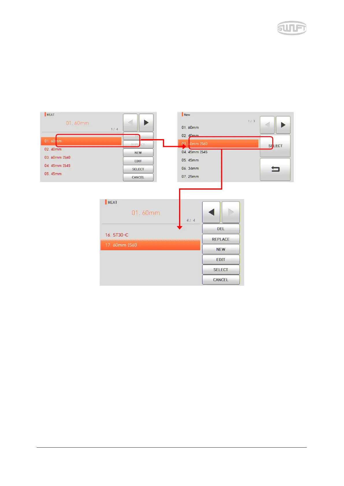 Touch “NEW” icon and heater modes saved on the database are displayed on the screen. Select a