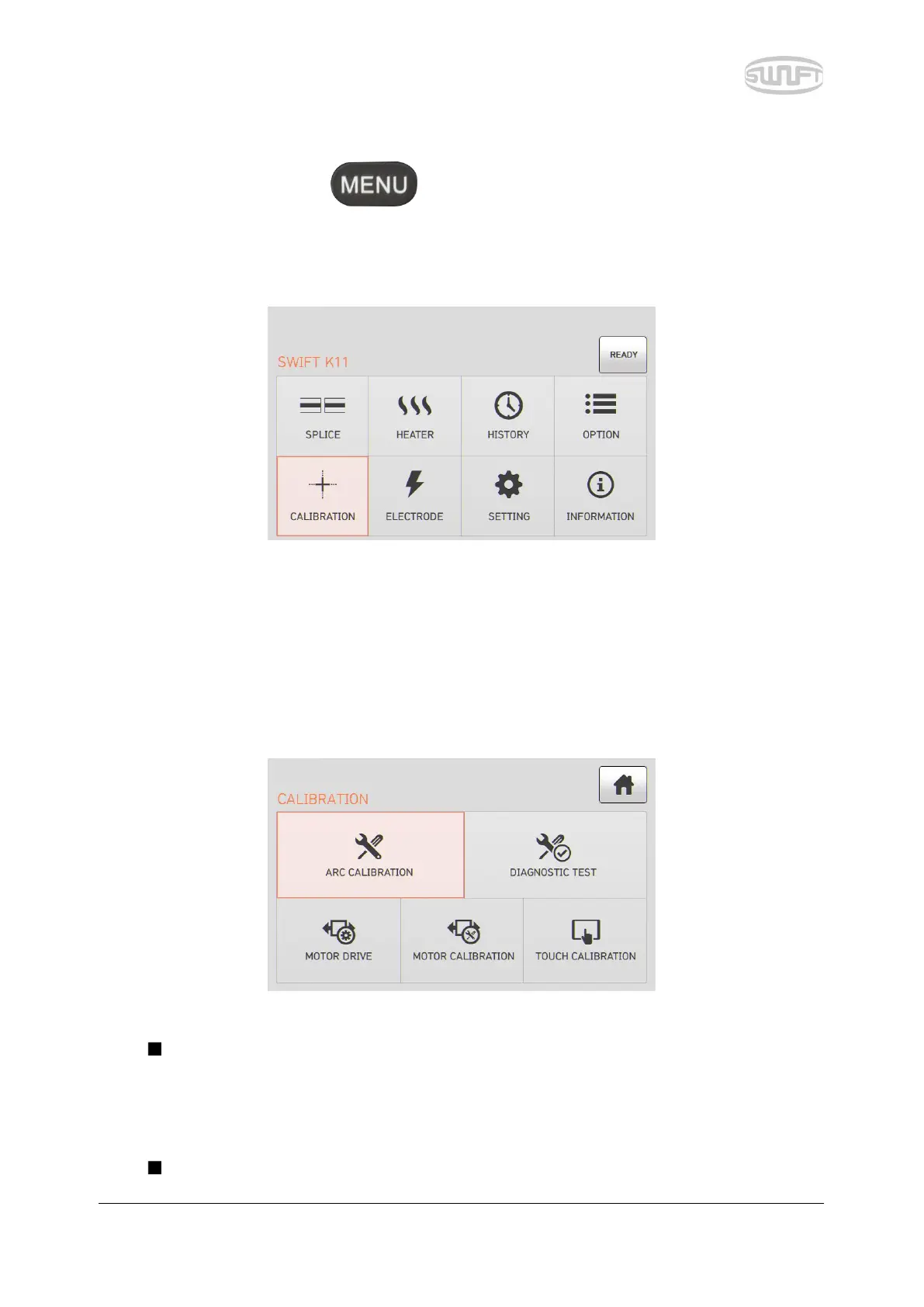 To import splice mode, press and then select “Calibration” menu by touching it. It