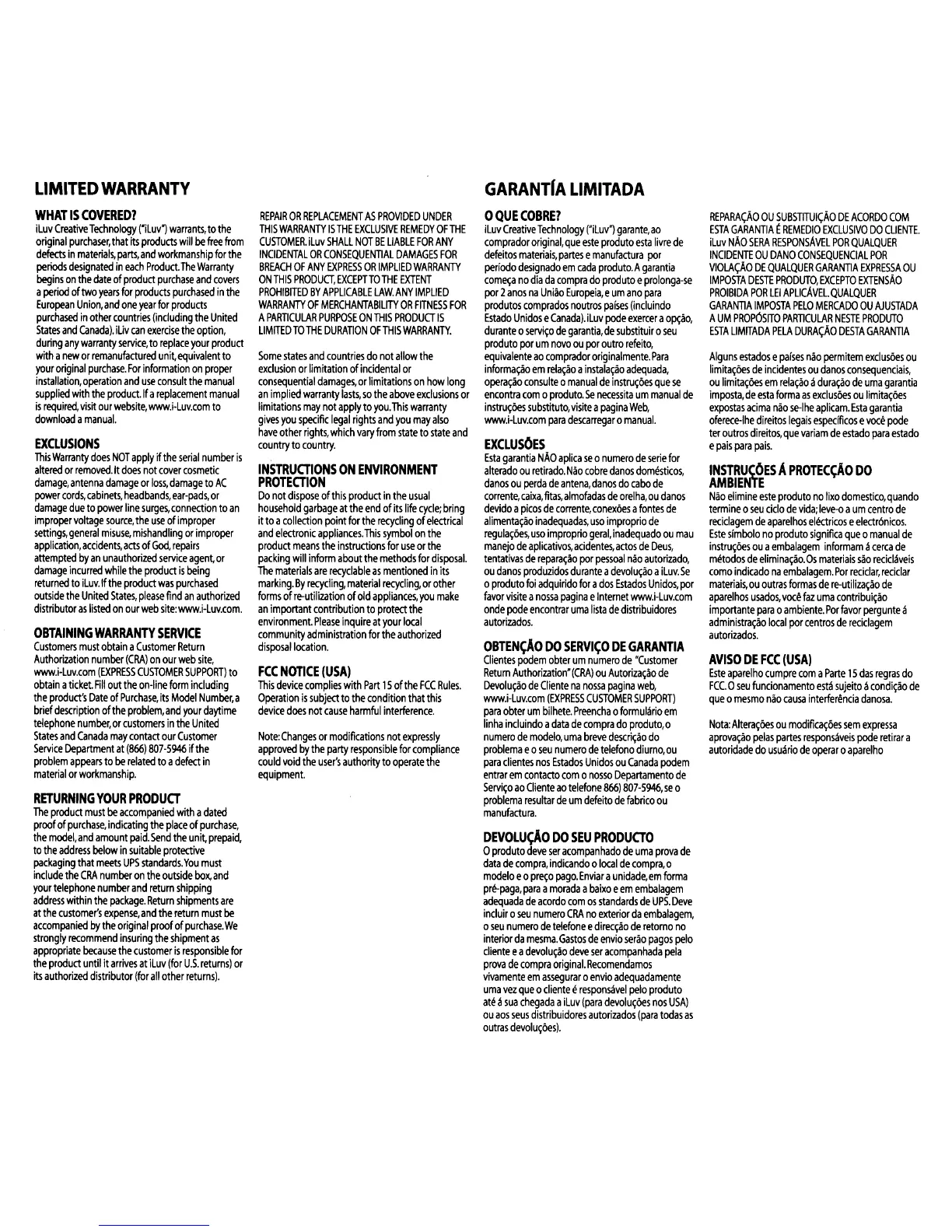 Iluv i1166 - Limited Warranty; What is Covered; Exclusions from Warranty; Obtaining Warranty Service