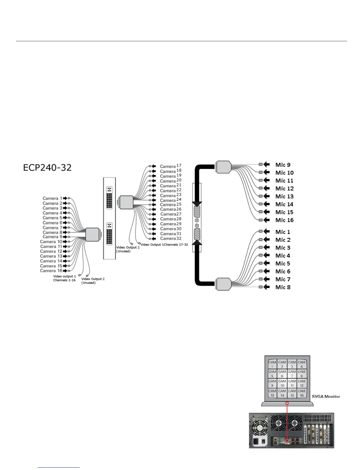 Video Out: One Public View Monitor (PVM) output is provided per 16 channel dongle. Video output 1 on each dongle will provide the