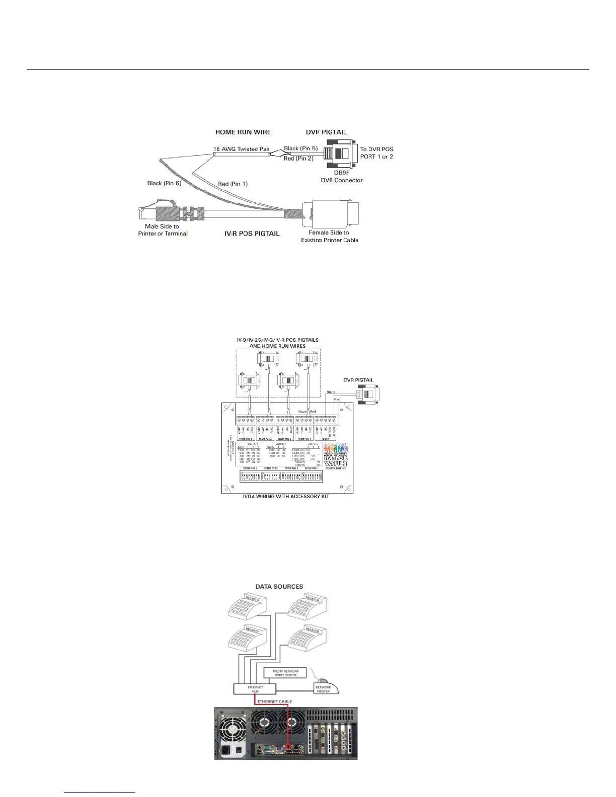 cessory pigtails plus one RS232 null modem cable. This diagram illustrates (generically) how one POS Data Hub is wired.