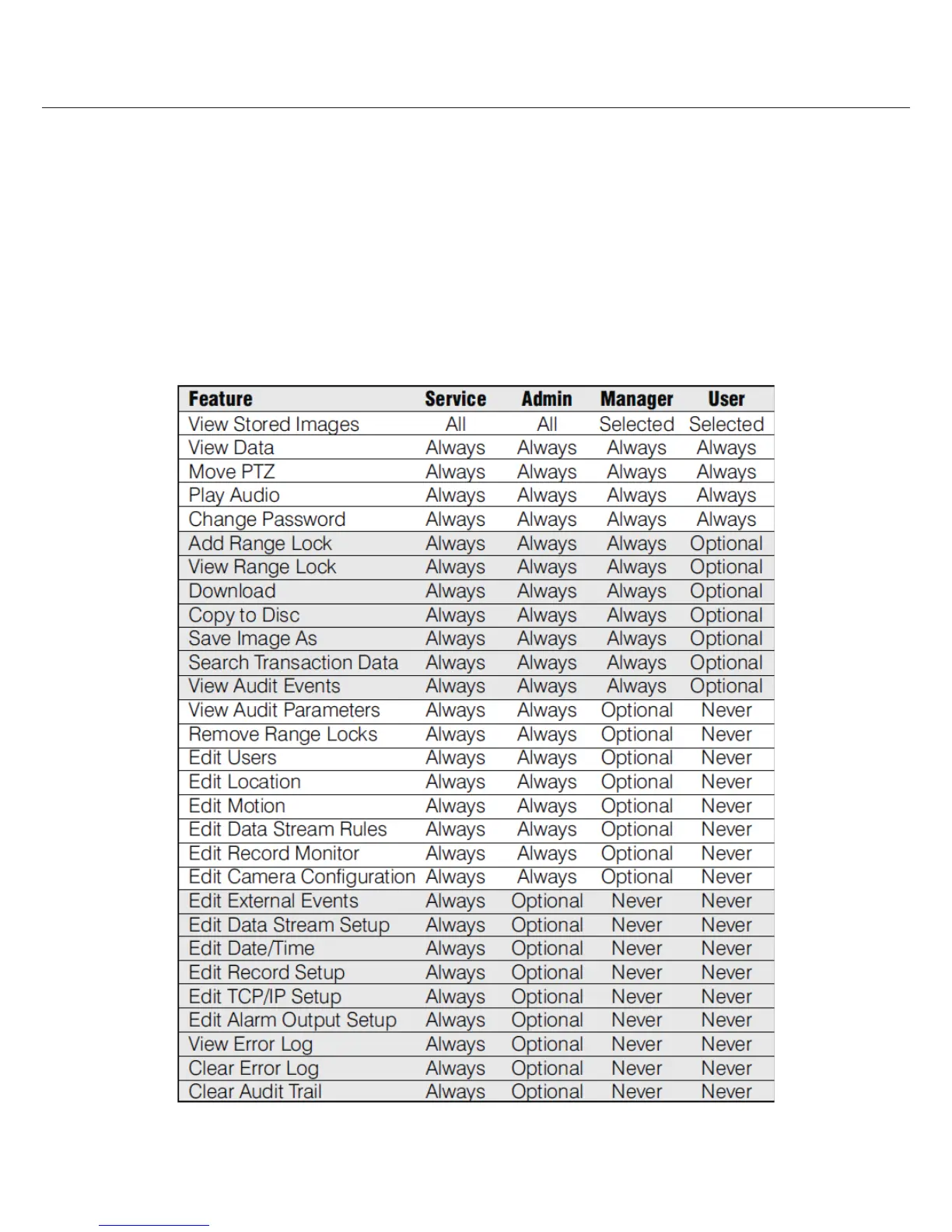 There are four levels of password security: “End User,” “Manager,” “Administrator,” and “Service.” Service and Administrator levels may