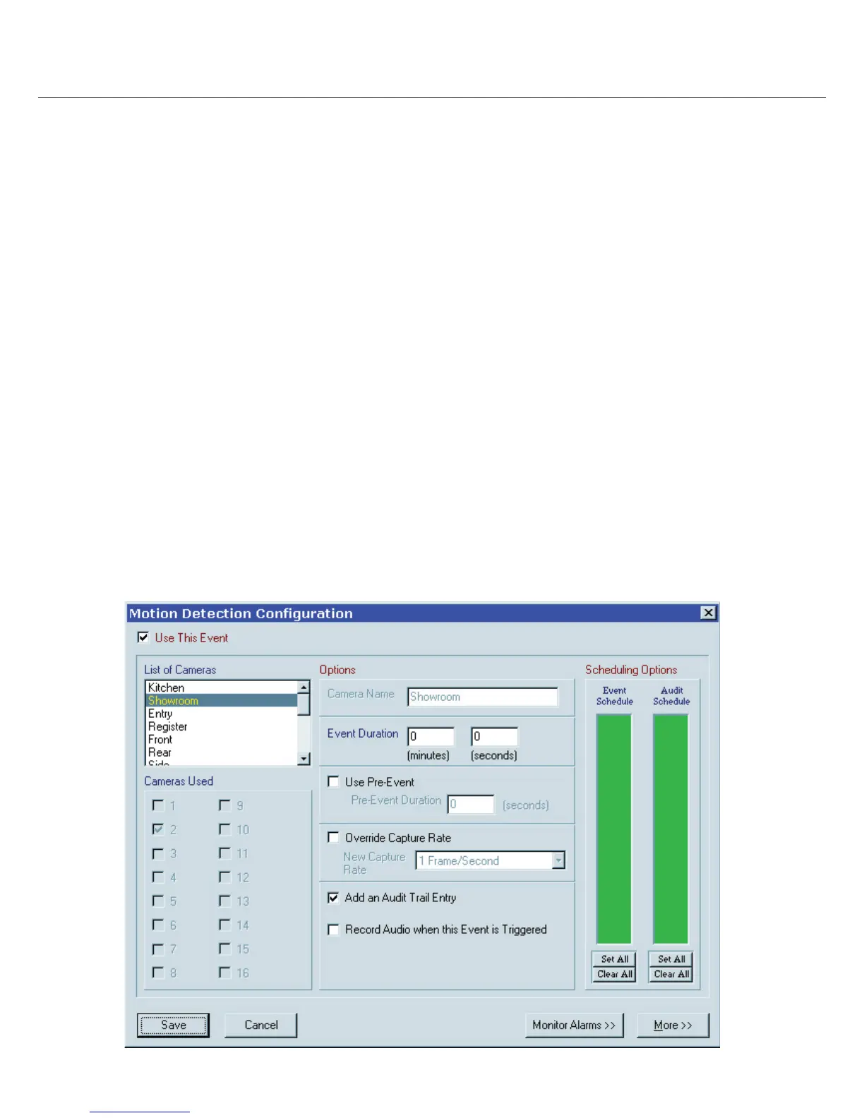 Using Motion Detection: Enable “Use This Event” for the selected camera. Use the “Event Schedule” to de ne the hours during
