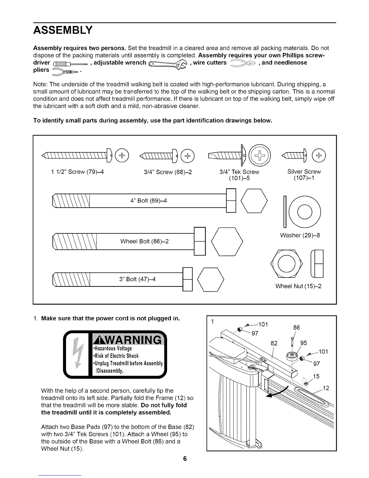 Assembly requires two persons. Set the treadmill in a cleared area and remove all packing materials. Do not