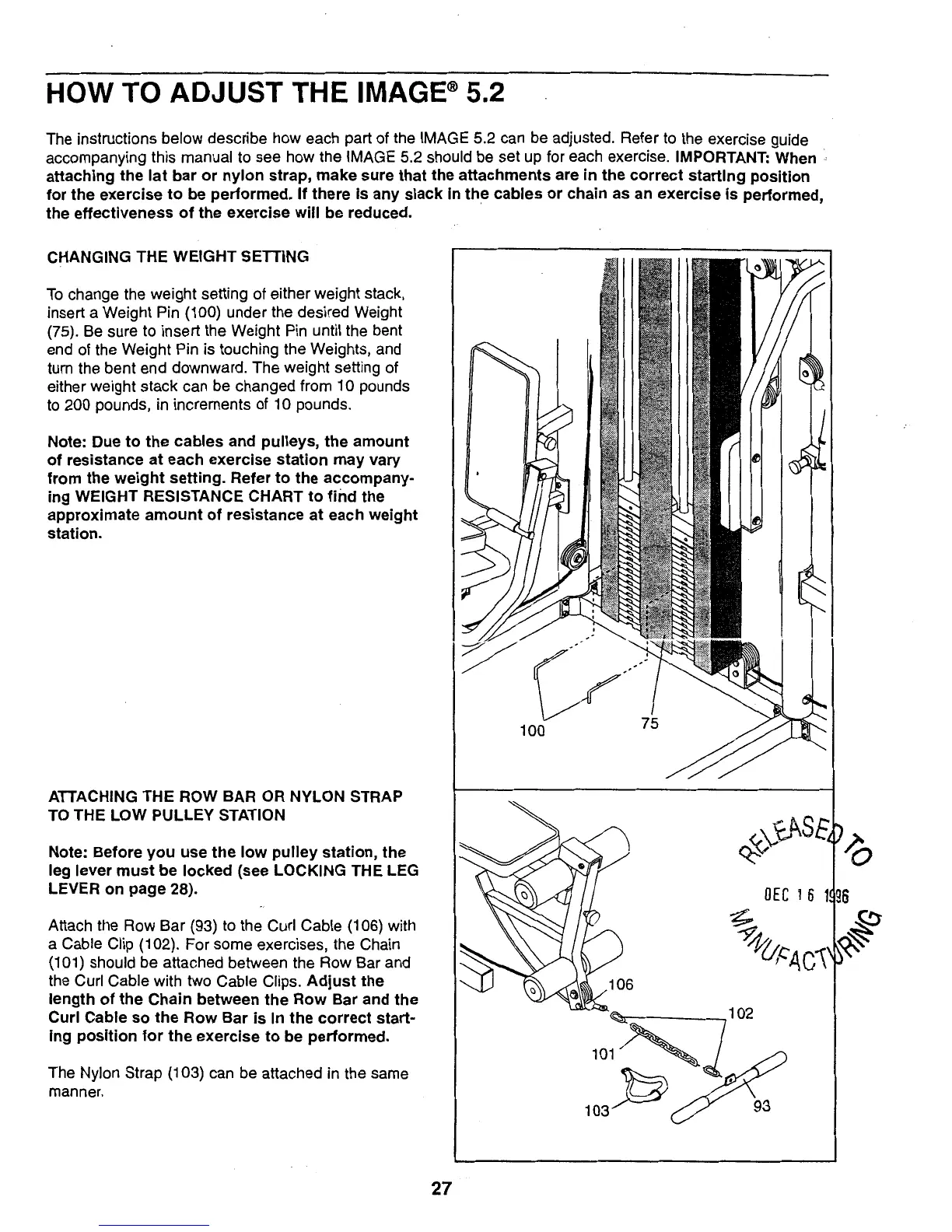 Image 5.2 - How to Adjust the IMAGE 5.2; Changing Weight Setting; Attaching Row Bar or Nylon Strap