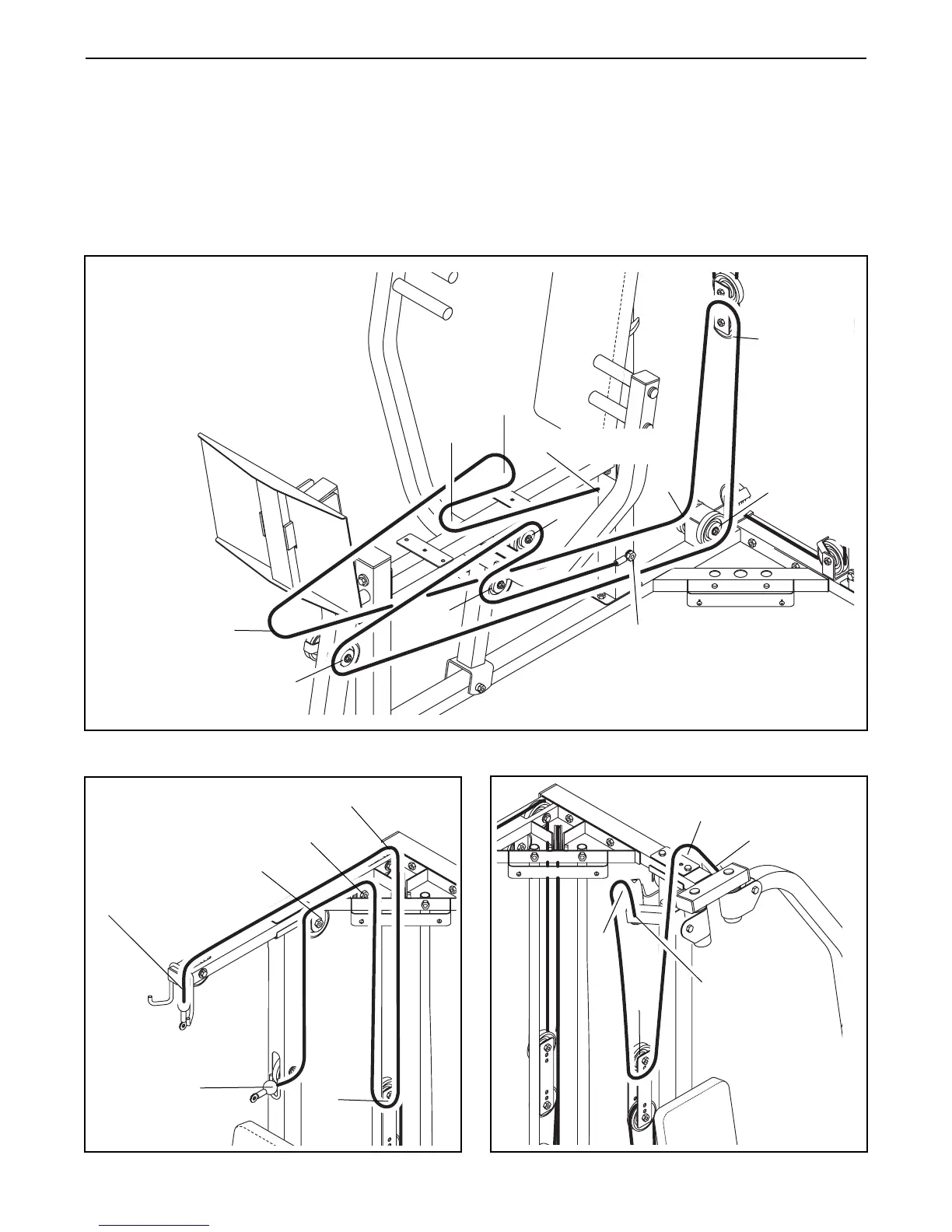 The cable diagrams on this page and the next page show the proper routing of the Leg Press Cable (75), the Ab