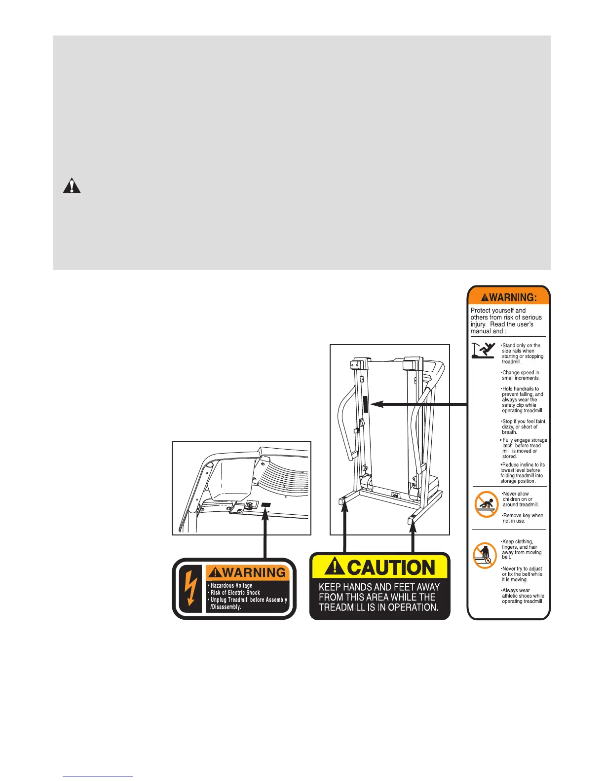The decals shown here have been placed on your treadmill. If a decal is missing, or