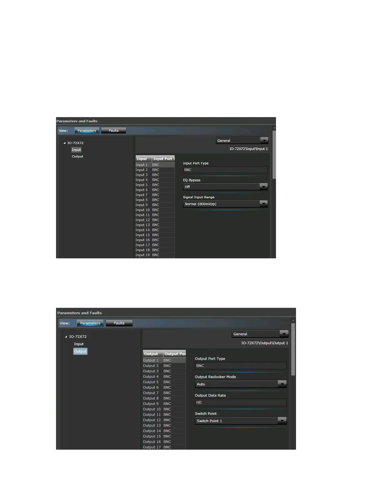 The frame has either 48 or 72 inputs and outputs and parameters for these are displayed to the right,