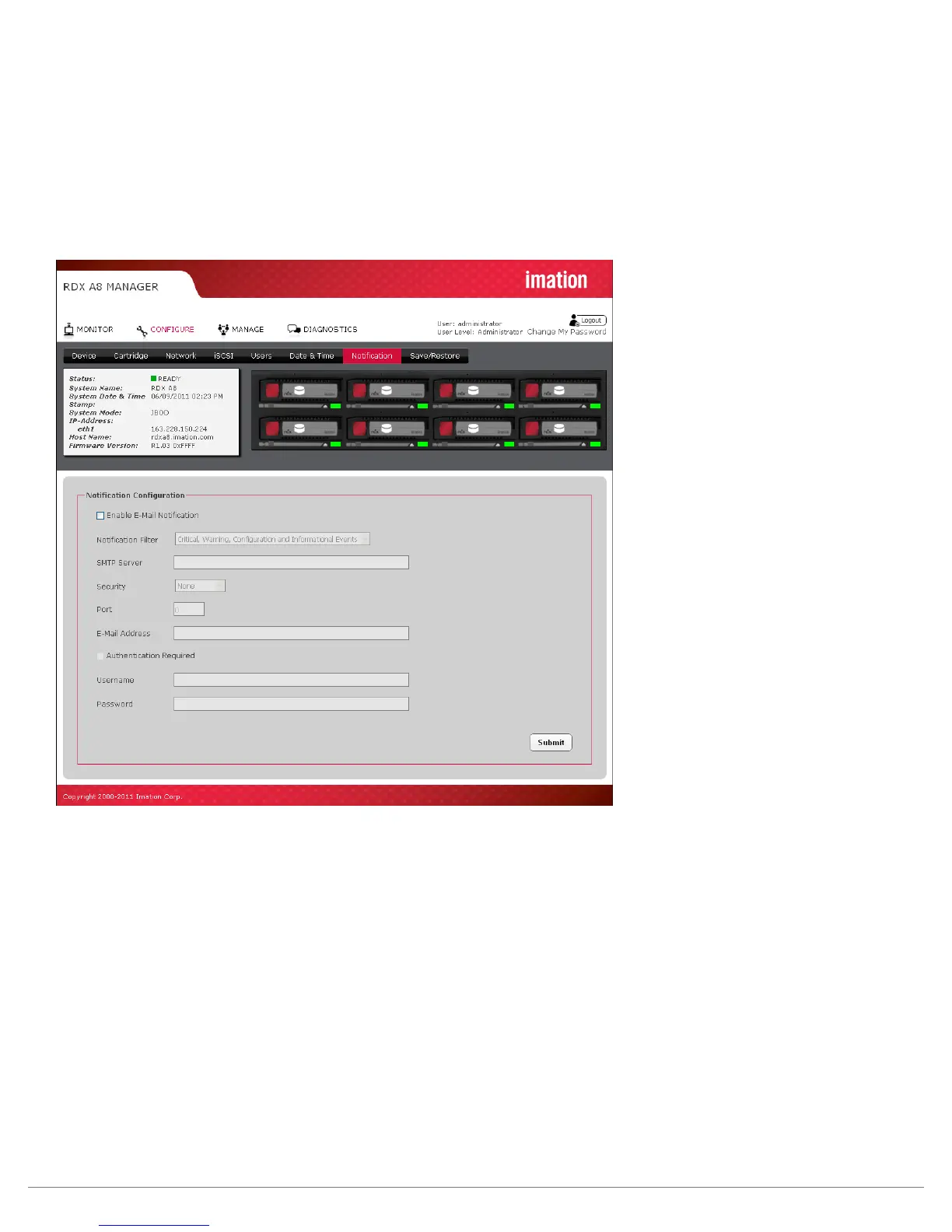 E-Mail Notification allows the user to configure the RDX A8 to send email to a selected account upon