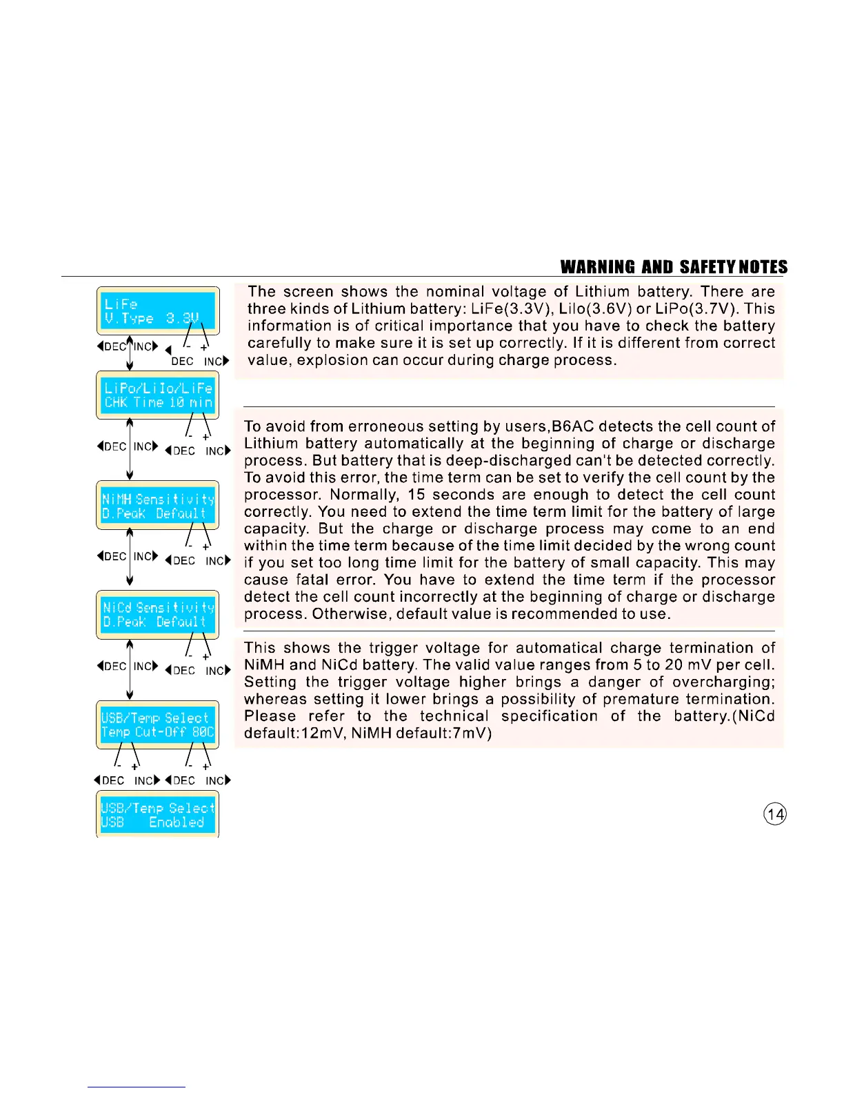 Imax B6AC - Advanced Setting Adjustments; Lithium Voltage Type Configuration; Automatic Cell Count Detection; NiMH;NiCd Sensitivity Configuration