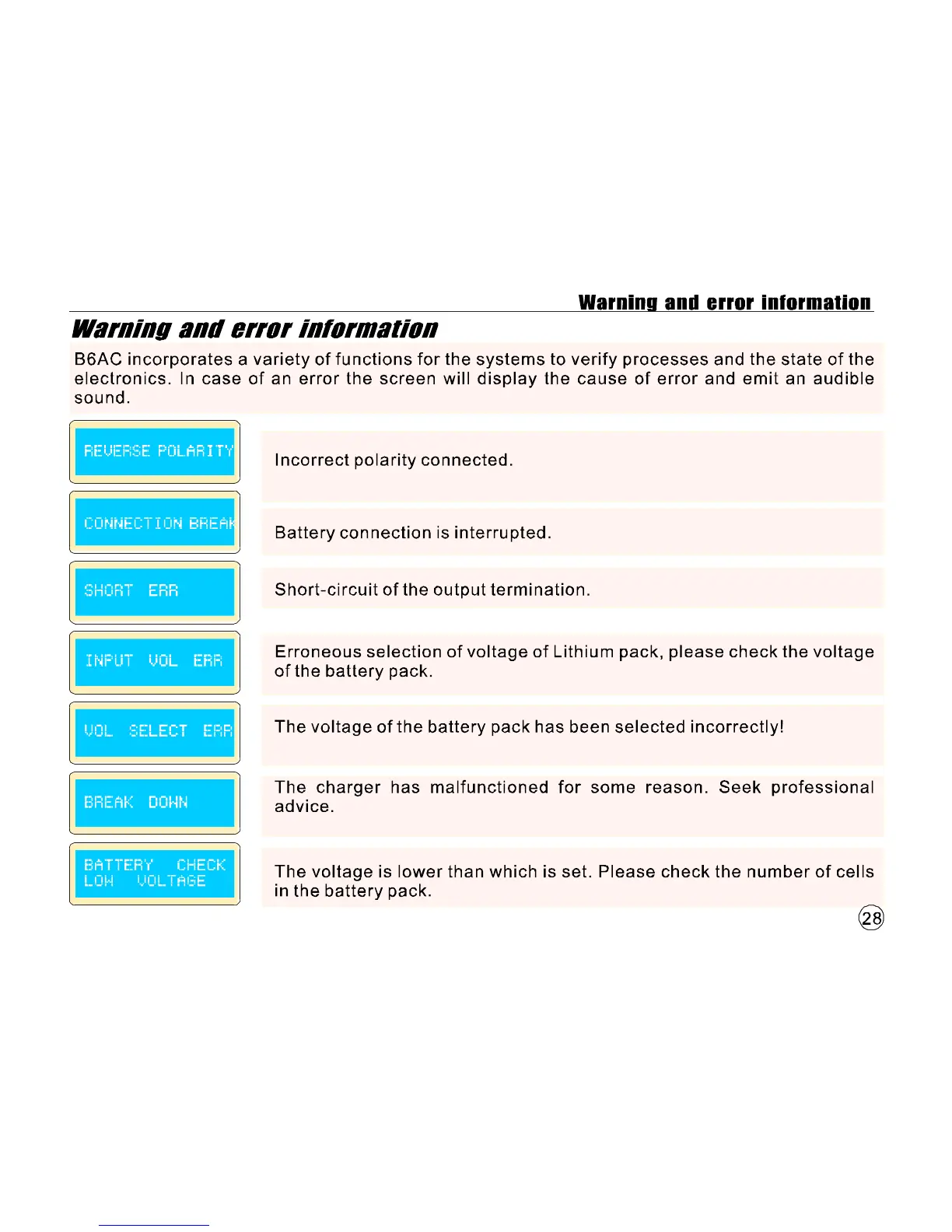 Imax B6AC - Warning and Error Information; Reverse Polarity Error; Connection Break Error; Short Circuit Error