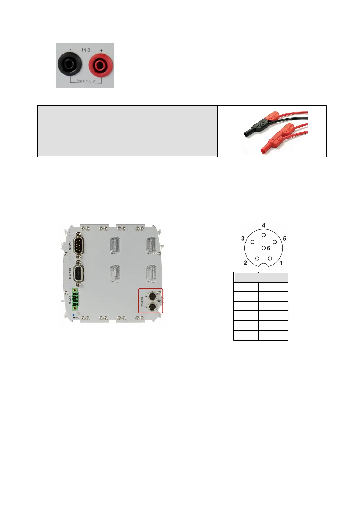 The imc CANSAS-HVCI8 module ist equipped with 2x 6-pin Service connectors on the rear side. Those