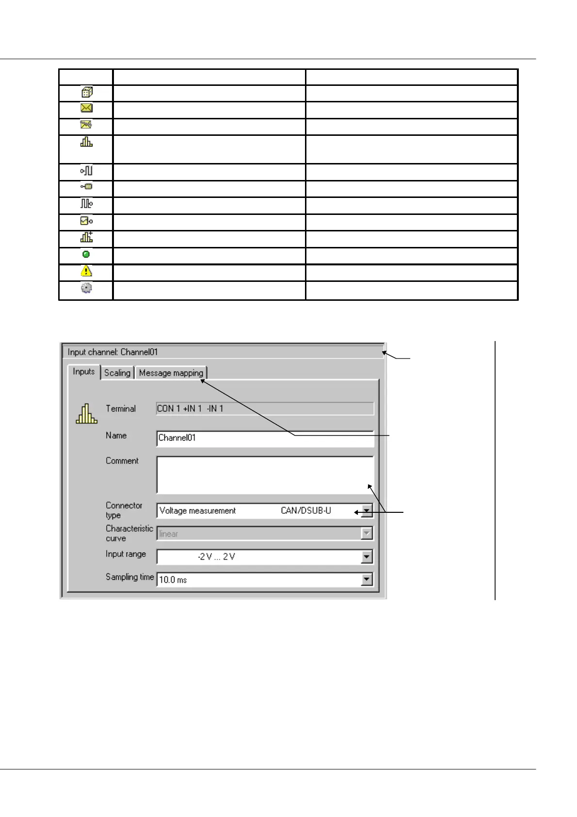 name, input configuration, input range, sampling